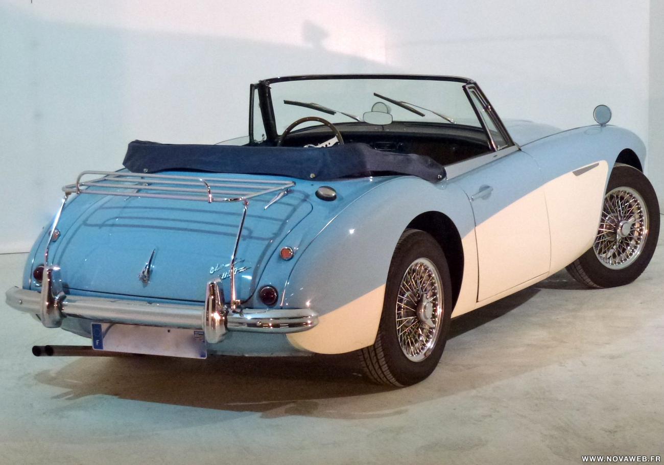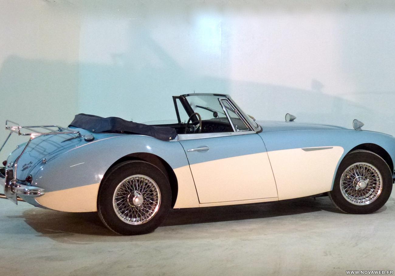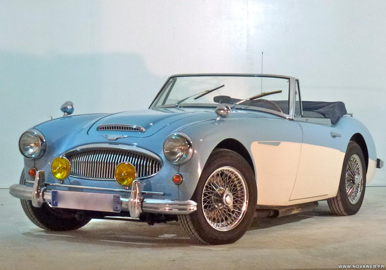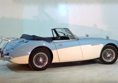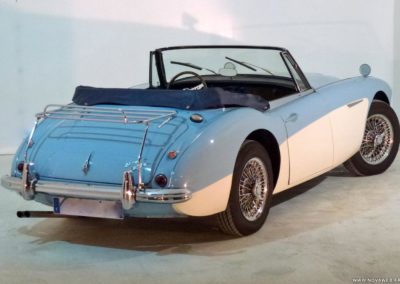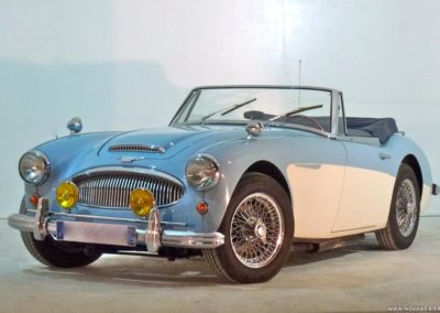 Austin-Healey 3000 MK3 BJ8 2+2 « Healey blue » et flancs Old English White. Tableau de bord ronce de noyer. Intérieur vinyl bleu avec moquettes bleues en laine. Capote, couvre capote et couvre tonneau. Boite 4 vitesses avec Overdrive. Compressions et pression huile parfaites. Nombreux frais mécaniques effectués récemment. Vendue révisée complètement. Contrôle technique à jour. Part toute distance.