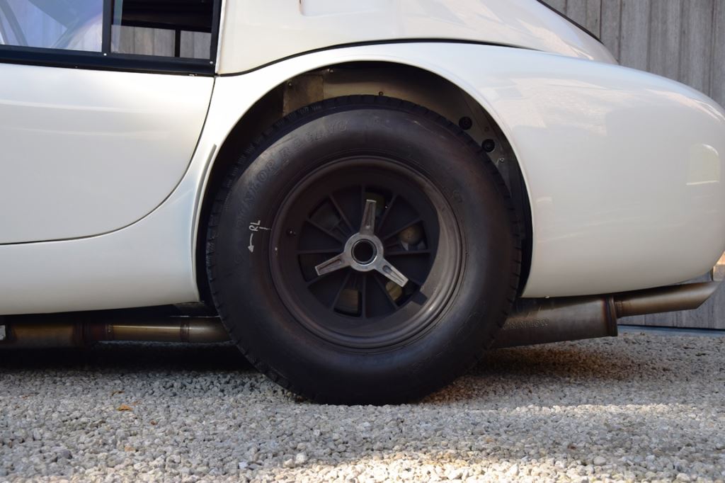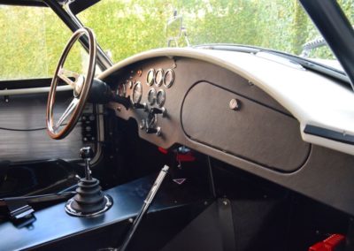 A fresh 289 Mathwall engine well revised by Burgol Racing Technologie Switzerland produce 460 bhp on the dyno. The exhaust is a full stainless steel system with 4 mufflers to suit modern noise requirements. The brand new T10 gearbox is made in accordance with FIA recognition form 1, and paired to a final drive with H/D output shafts. The rear diff is correct cast iron 4HU Salisbury differential mounted with homologated diff cooling and 3.77 ratio. The Cobra has a brand new 140 liters Premier Bladder fuel tank with 20L reserve tank and dual Holley fuel pumps for durability. The suspension has rosejointed A-arms and Koni 8211 shock absorbers which were especially developed for racing Cobra’s (and the very best you can use on these cars). The leafsprings are heavily upgraded for high speed racing. The brakes have Tilton main cylinders with Girling CR and ORA calipers fitted with Mintex brake pads. To get all this power on the road, this beautiful Cobra sits on Crosthwaite & Gardiner magnesium wheels fitted with L-section Dunlop Racing tyres. Everything is very lightweight, including the full aluminium body and Le Mans hardtop. The well appointed interior is period correct, with the fully original Cobra 289 dashboard layout and rare Stewart Warner gauges, correct Ford toggle switches and the typical wooden steering wheel. The driver is perfectly installed in a lightweight Tillet racing seat with full FIA approved 6-point harness and FIA specification FULL roll cage – all inspected and approved.