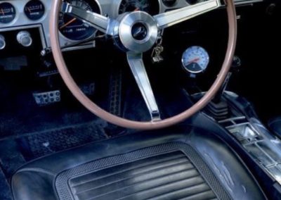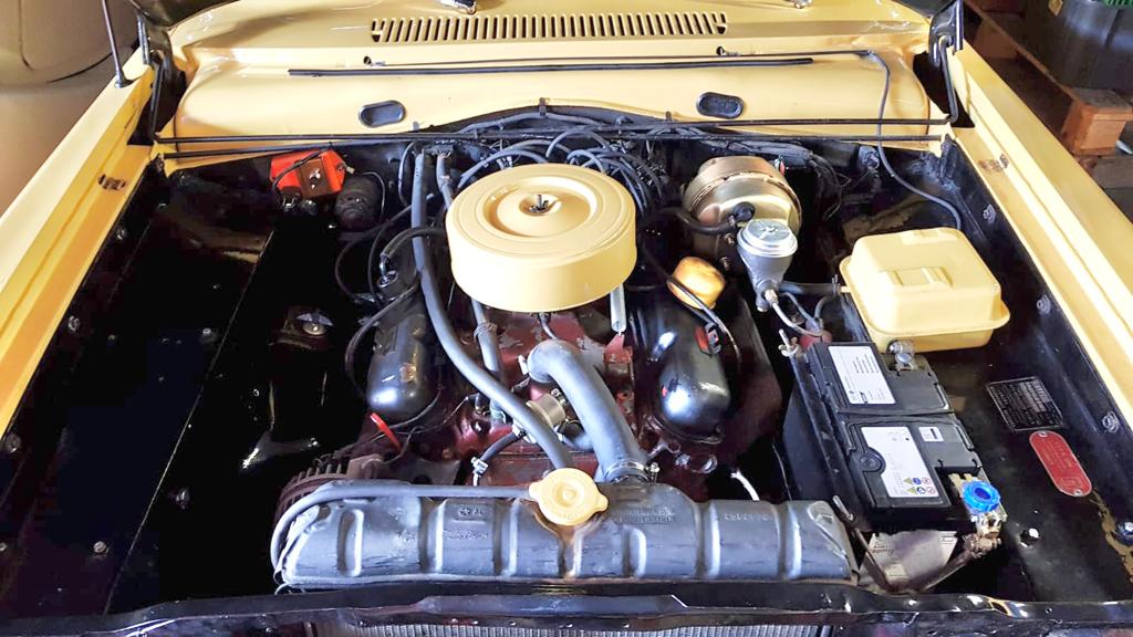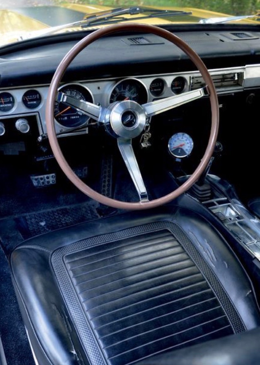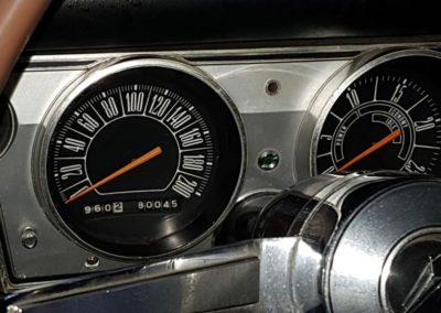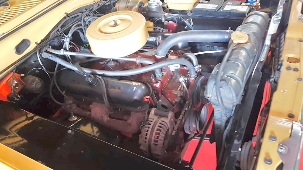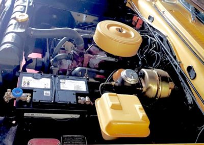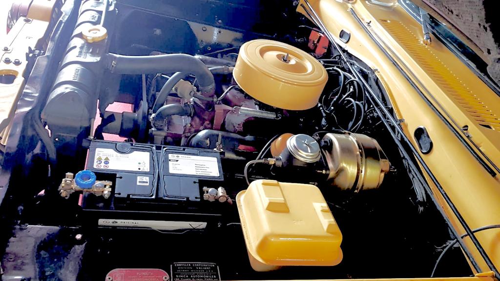 L’exemplaire que nous présentons a été vendu neuf en France par l’importateur Simca Automobile le 15 septembre 1966. Il aurait alors appartenu à une personnalité du show-business. Cette auto présente aujourd’hui une saillante peinture jaune, son toit, ses jantes et ses bandes de couleur noire lui confèrent un look racing à l’américaine. A l’intérieur, on retrouve une sellerie en skaï dans son jus avec une console centrale, qui était à l‘époque en option. Au niveau mécanique, notre Barracuda est équipée du V8 de 4.5l développant 180 ch, associé à une boite de vitesses manuelle à 4 rapports. Lors de notre essai routier, nous avons été surpris par le confort d’utilisation de ce muscle car. La puissance de son moteur est parfaitement exploitable grâce à la boite manuelle qui permet de grimper dans les tours.